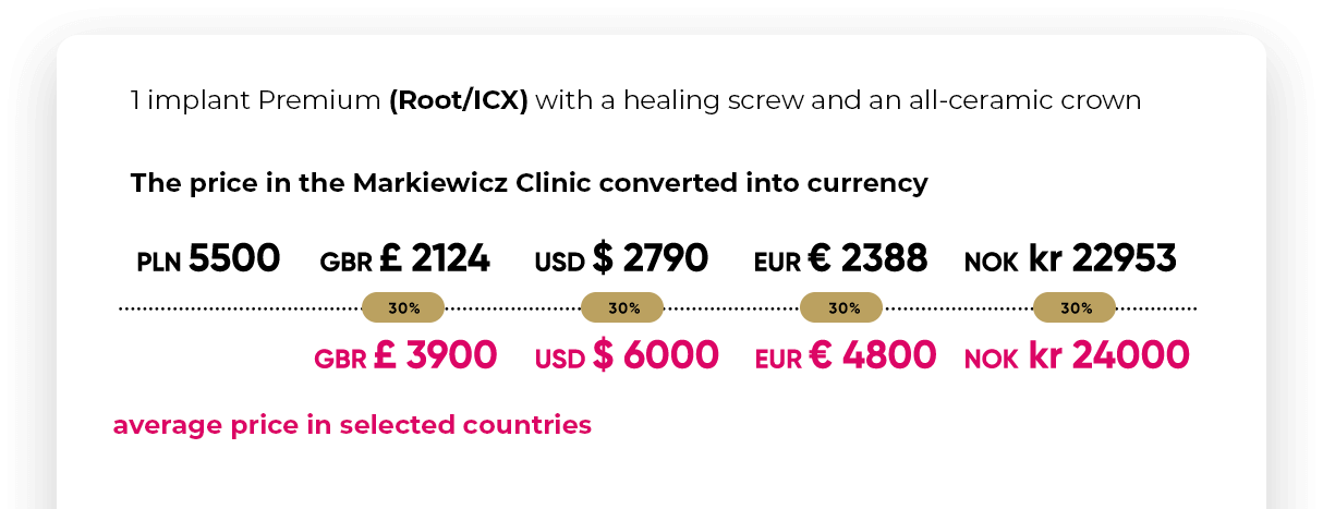 Taking into account the risk of losing the adjacent teeth after grinding them under the bridge, the price of the implant is definitely lower than the price that the patient would have to spend on restoring the missing teeth, which is a common complication after removing bridges. The price of a dental implant depends on the patient's bone conditions and the implant system used. After the consultation visit, in which 3D digital diagnostics is performed, the patient receives a complete quote for implantological treatment.